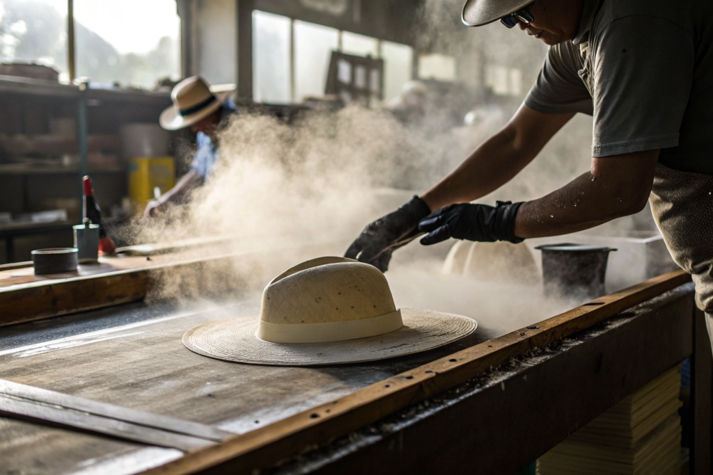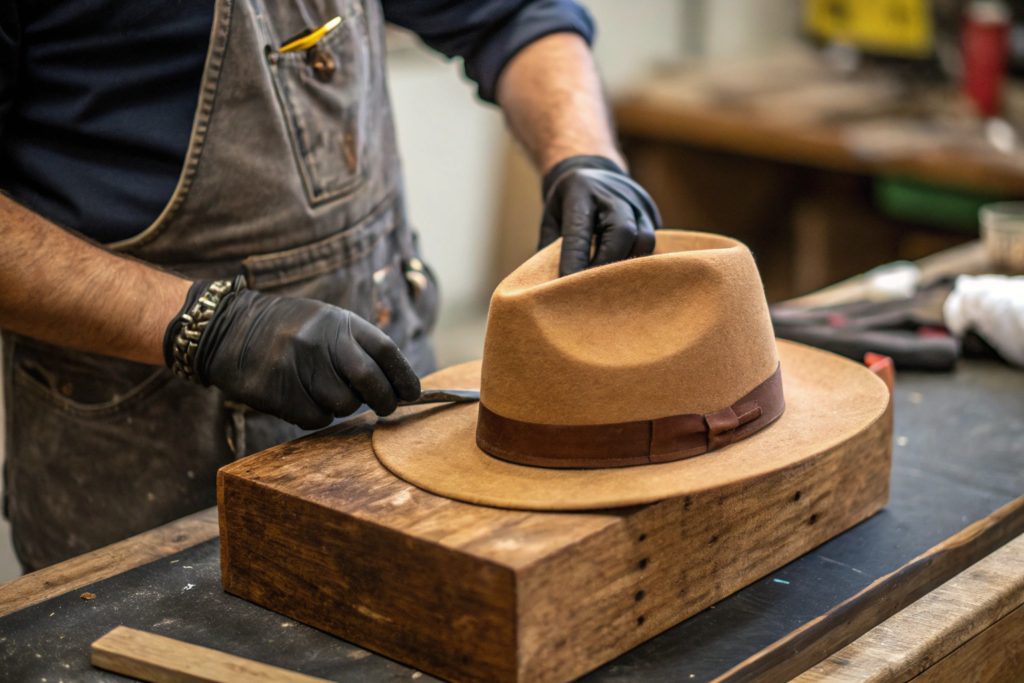 - Pouncing: The surface of the hat is sanded with very fine sandpaper to remove any loose fibers, creating a perfectly smooth, almost velvety finish.
