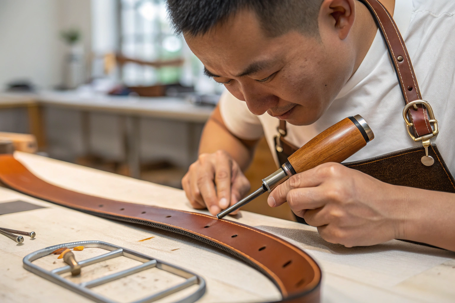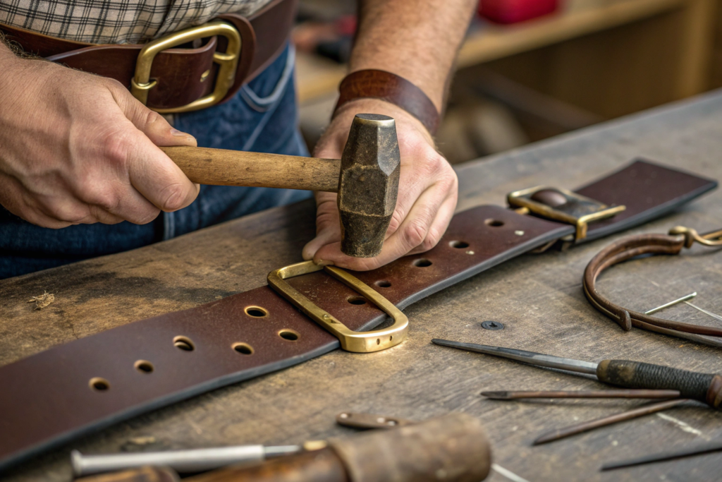 This stage transforms the leather strap into a functional belt. The precision here dictates the belt's usability, security, and overall professional finish. A poorly set buckle or misaligned holes can ruin an otherwise perfectly crafted strap.