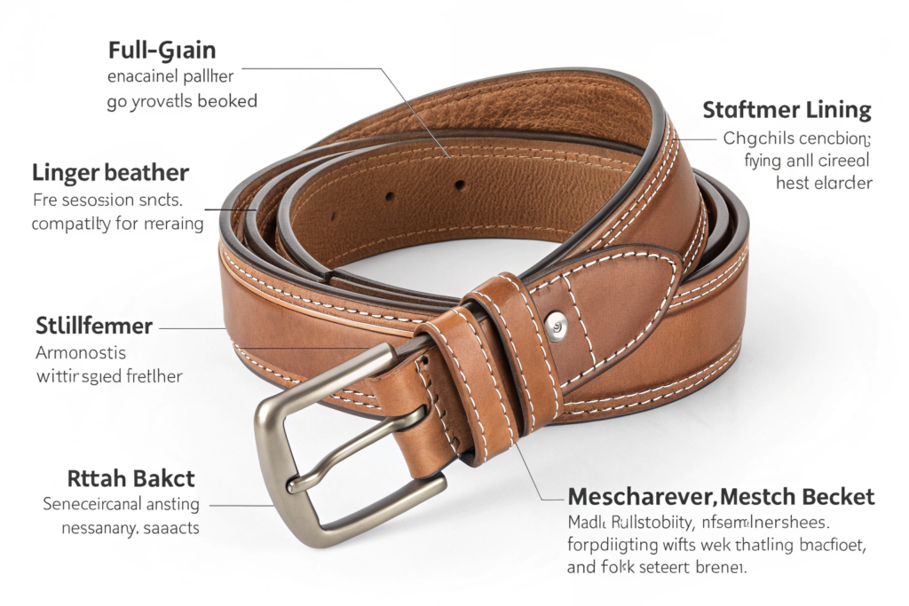 A quality belt that lasts for years is defined by four components: the leather, the lining, the stiffener, and the buckle attachment. Full-grain leather from the top layer of the hide is essential. Corrected-grain or bonded leather will crack and peel. The lining must be a compatible material with similar stretch properties. If the lining stretches differently than the face, the belt will curl. The stiffener, usually vegetable-tanned shoulder leather or rigid nylon, must provide memory without brittleness. The buckle attachment must be reinforced with a secondary leather patch or metal bar. A buckle screwed directly into the belt strap will fail within six months.