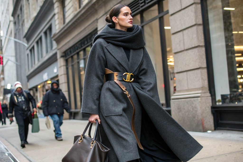 This is a significant functional and aesthetic shift. In the past, winter accessories were often hidden under coats. A belt was worn on the waist of the trousers, invisible beneath a parka. A small handbag was tucked inside the coat. For Winter 2026, accessories are moving to the outside. They are becoming part of the outerwear silhouette.