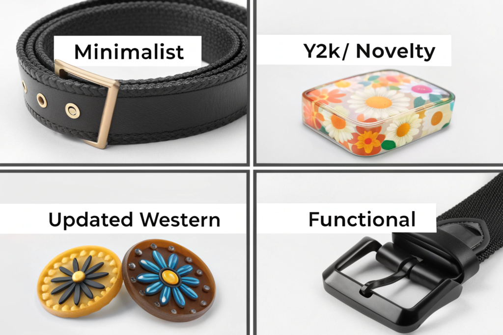 Currently, in-demand belt buckle designs for North American mall fashion blend authentic heritage aesthetics with modern, minimalist silhouettes and bold, playful statements. The top categories are: oversized, sculptural minimalism (think clean geometric shapes in matte or polished metal), Y2K-inspired novelty and logo-centric designs, rugged Western and harness-style buckles (updated with polished finishes or mixed materials), and versatile, interchangeable magnetic or snap-closure buckles that allow for easy styling. Success lies in the details—the finish, scale, and how the design connects to broader apparel trends like cargo pants, high-waisted denim, and layering.