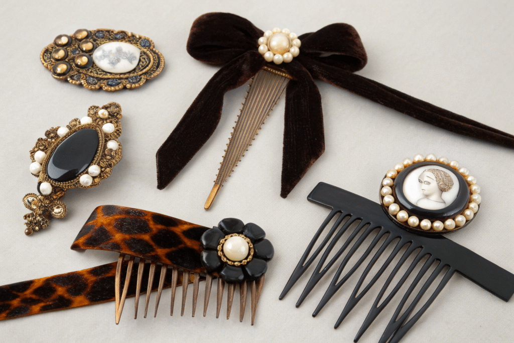 Edwardian and Victorian hair accessories reflect the formality and intricacy of these eras, emphasizing delicate materials, natural motifs, and refined craftsmanship. These pieces work beautifully with high-neck blouses, lace details, and structured silhouettes characteristic of late 19th and early 20th century fashion.