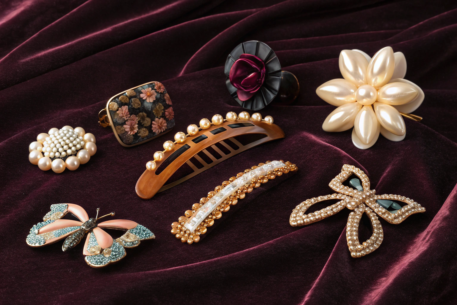 This trend is characterized by ornate embellishment. Think cameo silhouettes (with both classic profiles and modern abstract designs), scattered pearl accents, intricate filigree metalwork, and motifs like mourning lockets, forget-me-not flowers, and butterflies. The color palette is moody: jet black, deep burgundy, forest green, and antique gold. These clips are less about holding all your hair and more about adornment—used to pin back small sections, decorate a braid, or add a touch of drama to a chignon. They appeal to the consumer seeking individuality, storytelling, and a connection to craft.