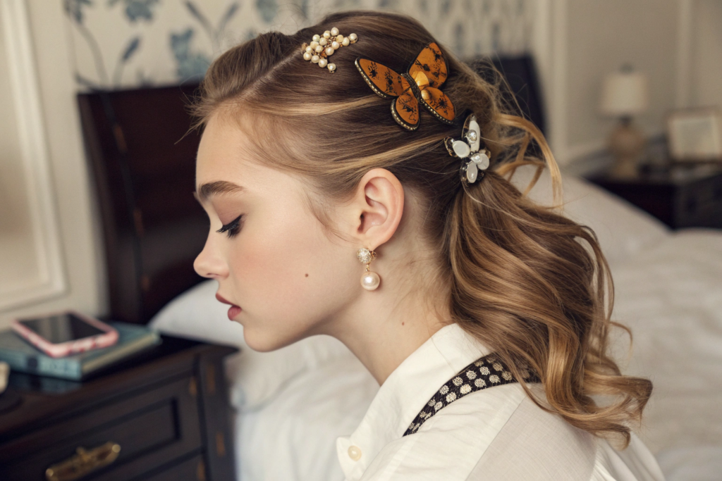 - Face-Framing & Accessorizing: Small clips like butterflies or pearls are used to pin back sections, adding detail around the face.