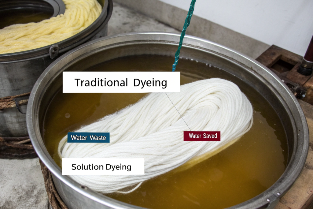 Compared to traditional dyeing, solution-dyeing offers significant, measurable benefits: