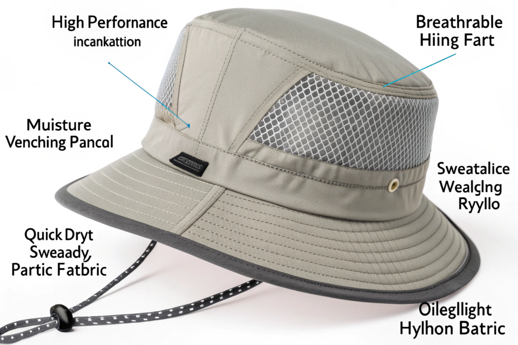 Beyond the string and brim, the most important features for a hiking bucket hat are breathability, moisture management, and packability. Look for hats with ventilation grommets or mesh panels, an internal sweatband that wicks moisture, and a fabric that is lightweight, quick-drying, and crushable for easy storage.