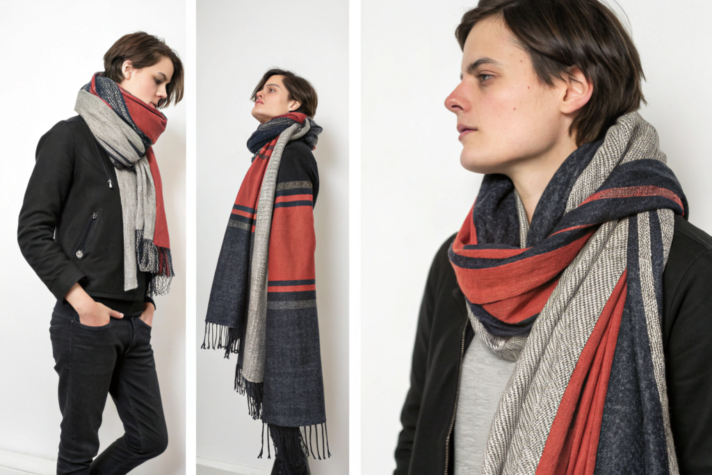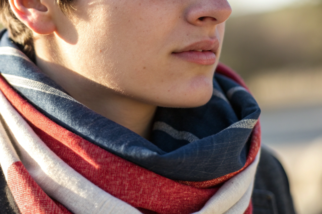 This is perhaps the most important functional benefit of a contrasting edge. When you wear a scarf, especially wrapped closely around the neck, the edge is the part that sits closest to your face. If the edge is the same color as the rest of the scarf, it blends in. If the edge is a contrasting color, it creates a distinct line that visually separates the scarf from your skin and your outfit.